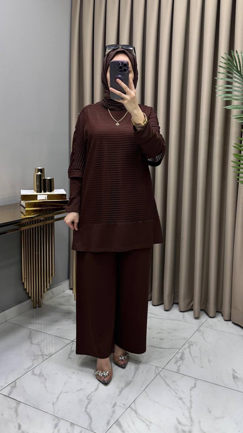 Ayben Fileli Üçlü Takım Kahve Kahverengi