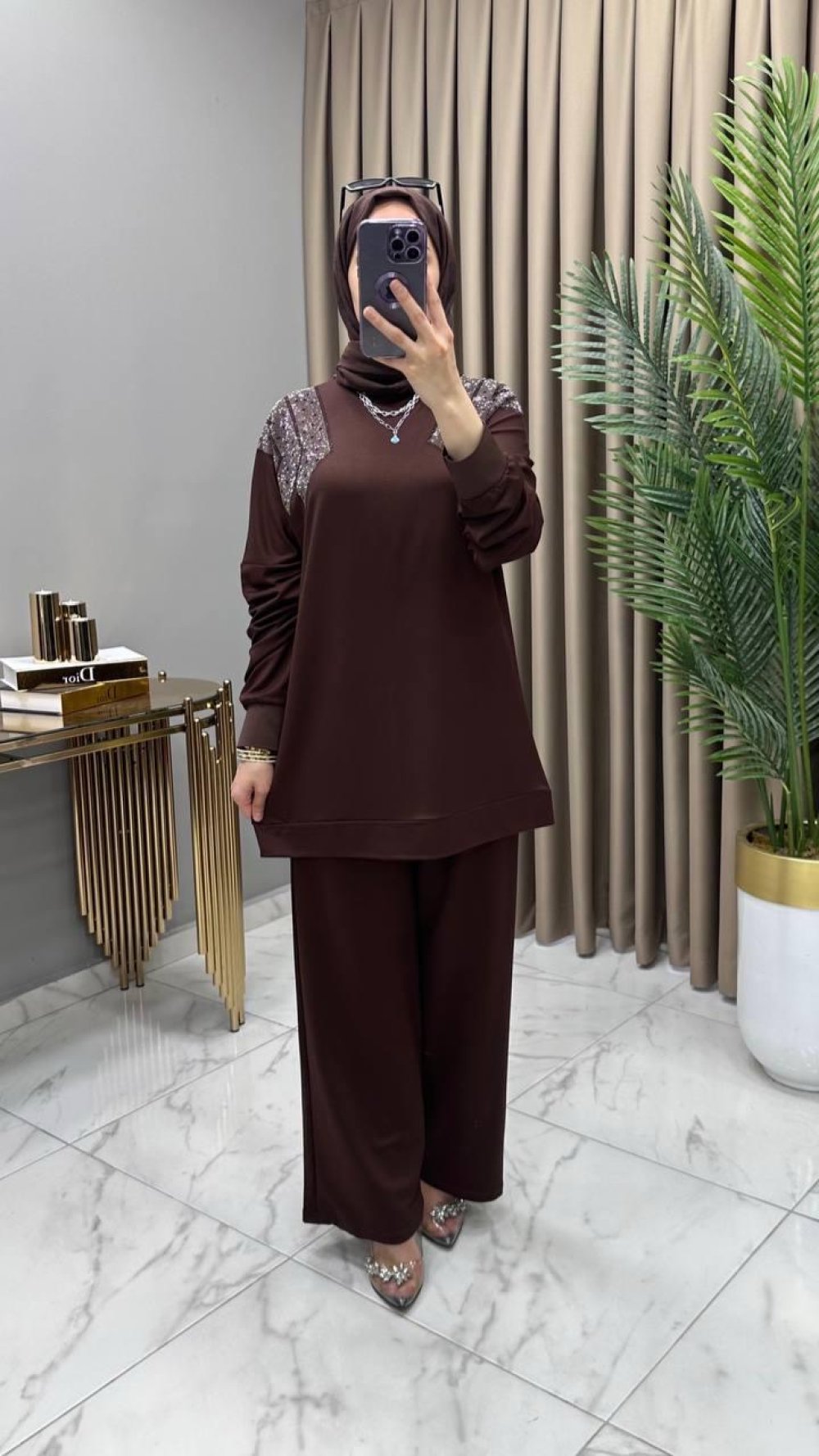 Gizem Taşlı Takım Kahve Kahverengi