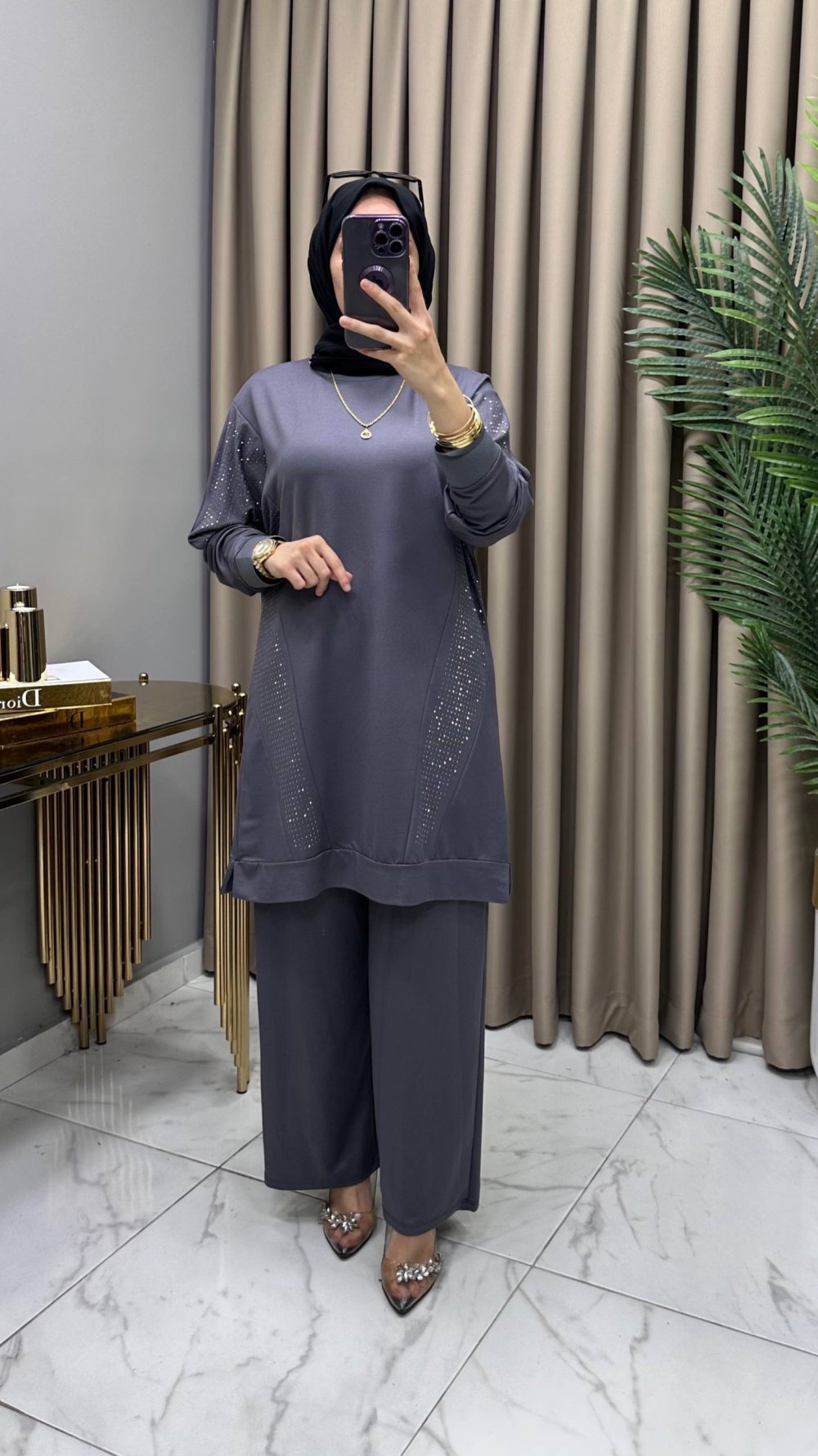 Hanımeli Taşlı Takım Füme Gri Füme