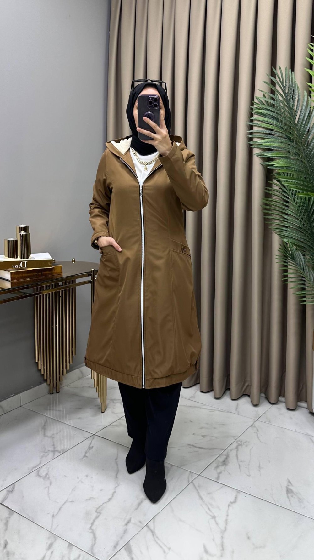 Bondit kumaş,kapşonu kürklüdür, kolları elyaf dolgulu,fermuarlı,